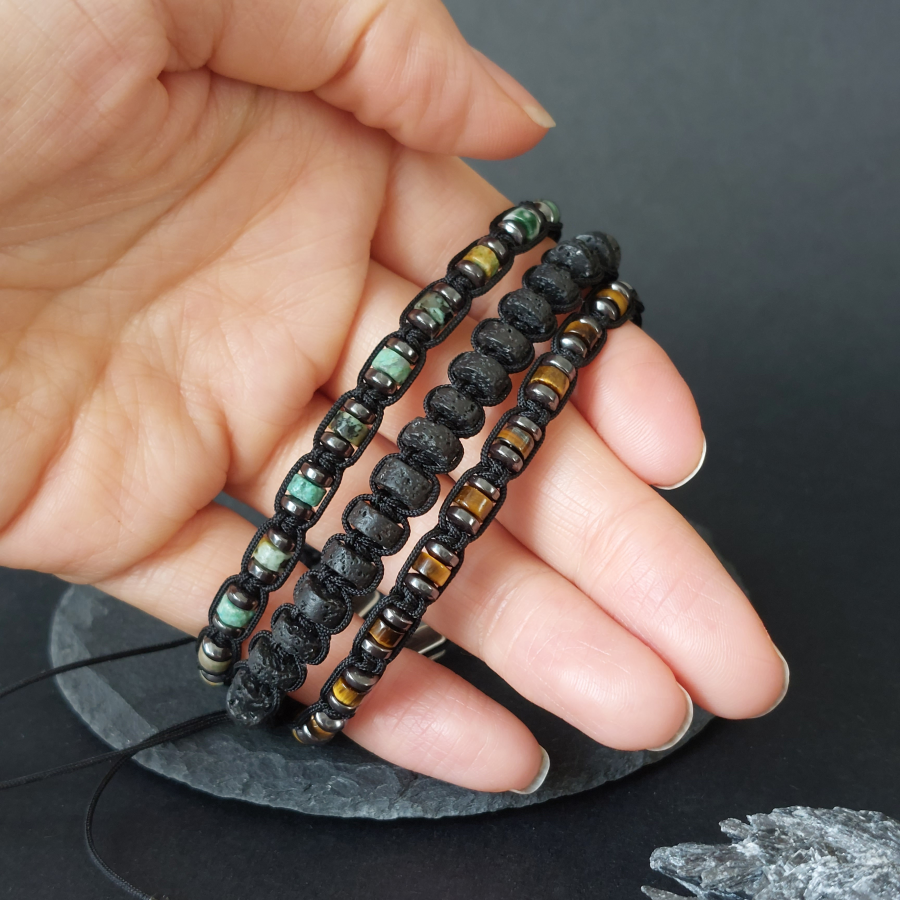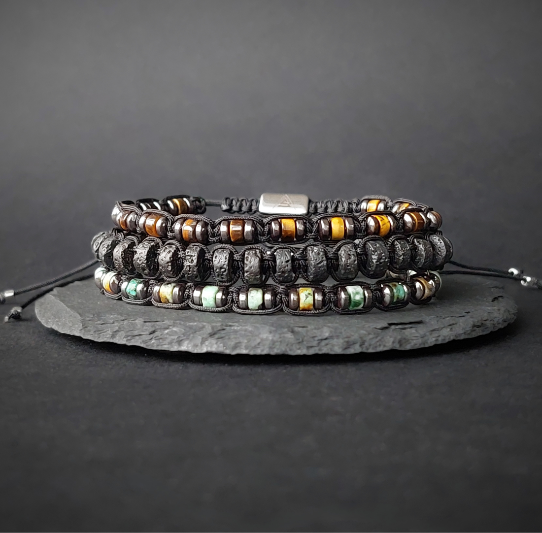 Meeste käevõrude komplekt “Kolme Vägi”, koosneb kolmest käevõrust ning kasutatud on nelja erinevat poolvääriskivi.
