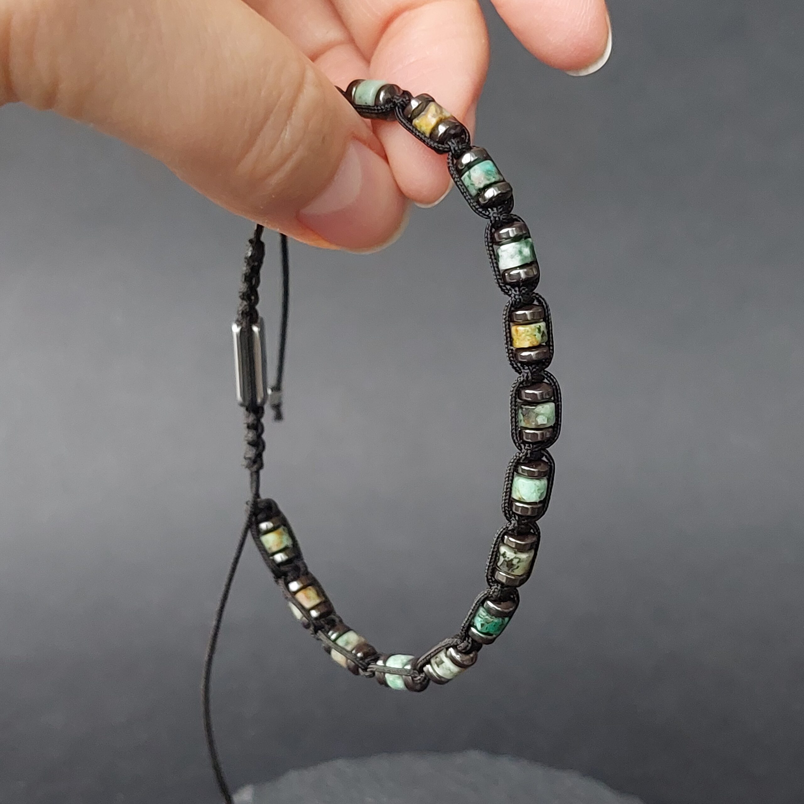 Aafrika türkiis on tegelikult täpiline sinakasroheline jaspis, mida kaevandatakse Aafrikas. Aafrika türkiis võib sisaldada ka musti või pruune värve. Seda tuntakse kui „evolutsiooni kivi“ ning see on tugevam kui traditsiooniline türkiis. Aafrika türkiis on positiivsete muutuste ja uute võimaluste kivi. Annab julgust teha muutusi ja püsida valitud rajal. Arvatakse, et see soodustab positiivset mõtlemist ja aitab vabaneda negatiivsetest harjumustest või mustritest. Kivi seostatakse ka enesekindluse ja sisemise tasakaaluga. Mõned usuvad, et see aitab selgemalt näha oma eesmärke ja suunda elus. Lisaks metafüüsilistele omadustele hinnatakse Aafrika türkiisi ka lihtsalt selle unikaalse mustri ja värvigamma tõttu – iga kivi on unikaalne.